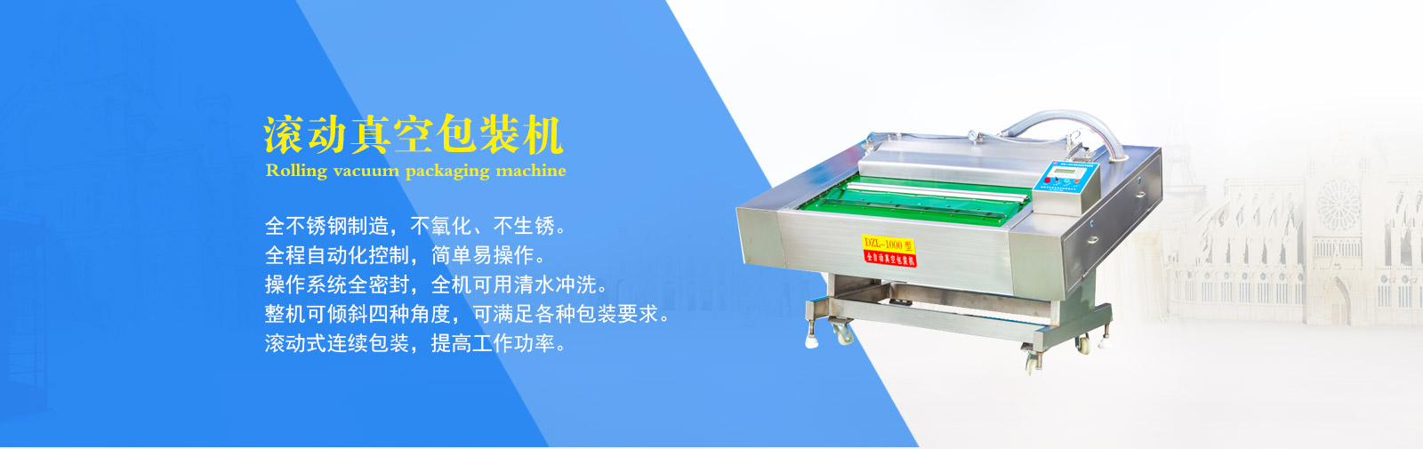 公司專業制造生產真空包裝機、拉伸膜真空包裝機、盒式真空包裝機、斬拌機、滾揉機、鹽水注射機、巴氏殺菌流水線等食品機械。其中生產的DZL-420全自動拉伸膜真空包裝機、DZL-1000型連續自動真空包裝機、真空滾揉機、斬拌機、鹽水注射機等都是通過本市技術監督局檢驗合格的產品。
